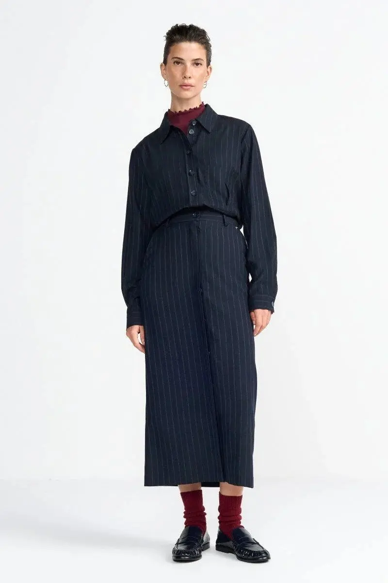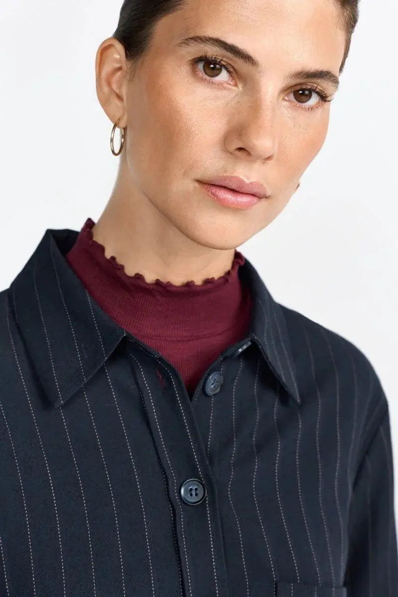Темно-синяя блуза Rich Royal сочетает в себе элегантность и современный шик. Тонкий узор в полоску, длинная планка с пуговицами и изысканный нагрудный карман делают ее незаменимой вещью для стильных образов.