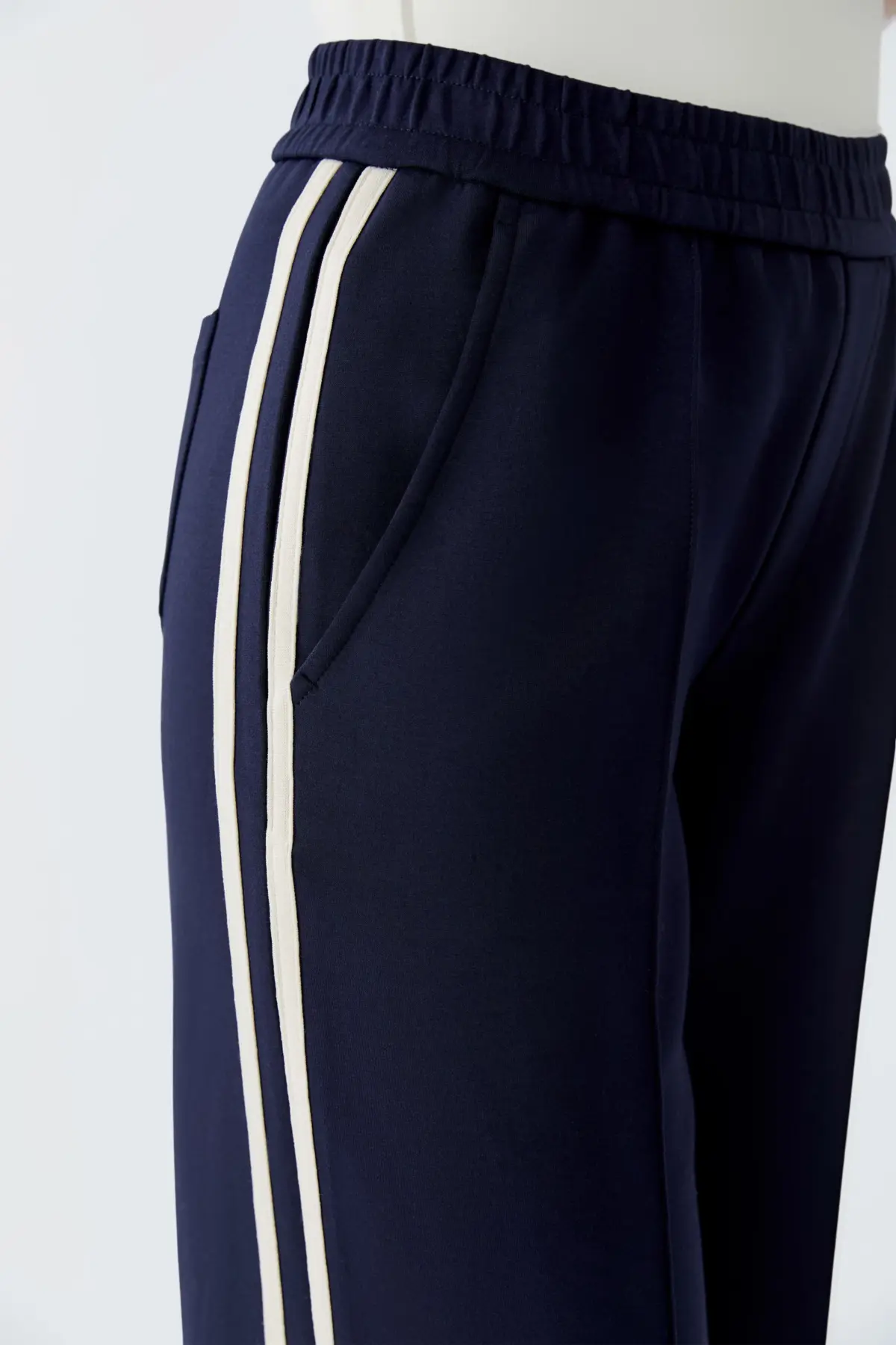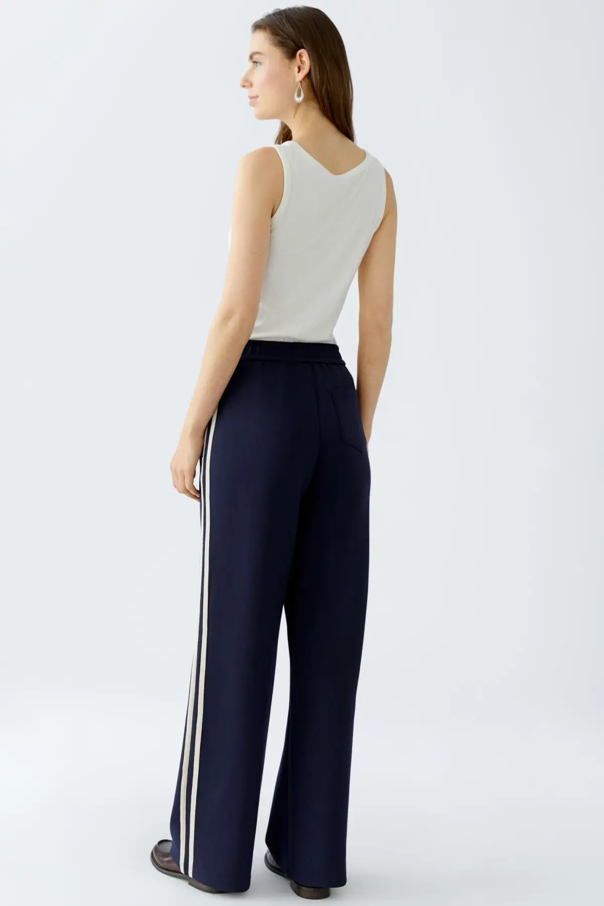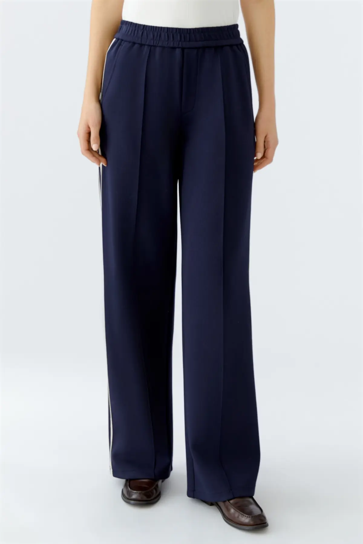 Брюки Oui с контрастными полосками по боковым швам — для спортивного, повседневного образа. У брюк свободный крой, прямые штанины, стандартная длина, удобный эластичный пояс для легкого надевания, боковые карманы, накладной карман сзади, спереди фиксированная заутюженная складка.