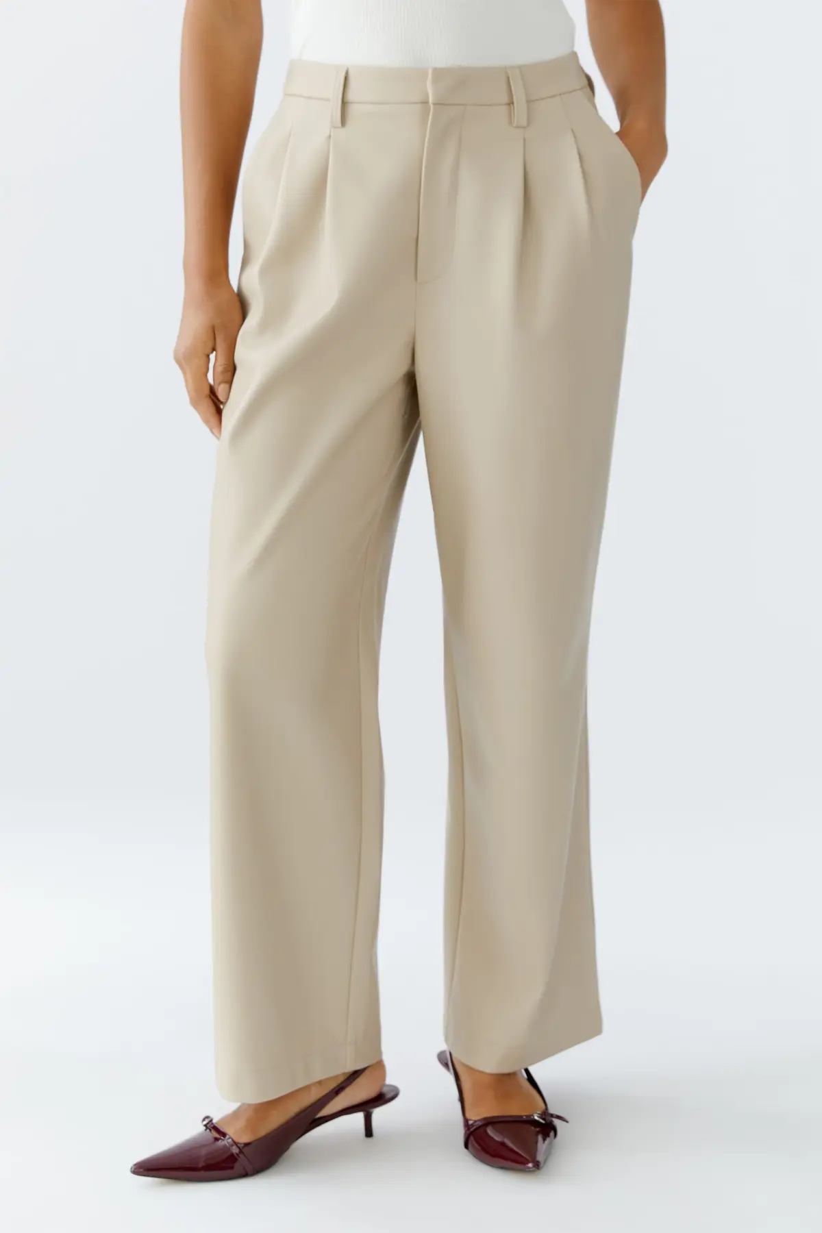 Брюки из искусственной кожи Oui — идеальное дополнение к любому трикотажному верху. Брюки выполнены из мягкого материала, имитирующего кожу, с покрытием из смеси полиэстера и эластана. У брюк свободный крой, укороченная длина, пояс со шлевками, крючком и молнией.