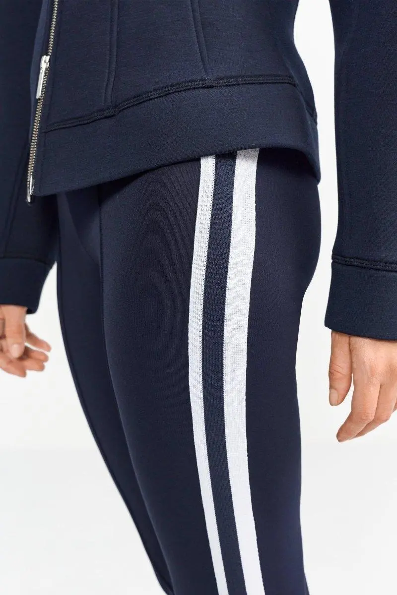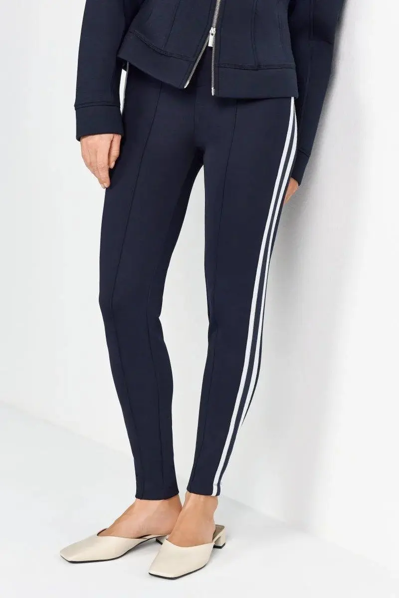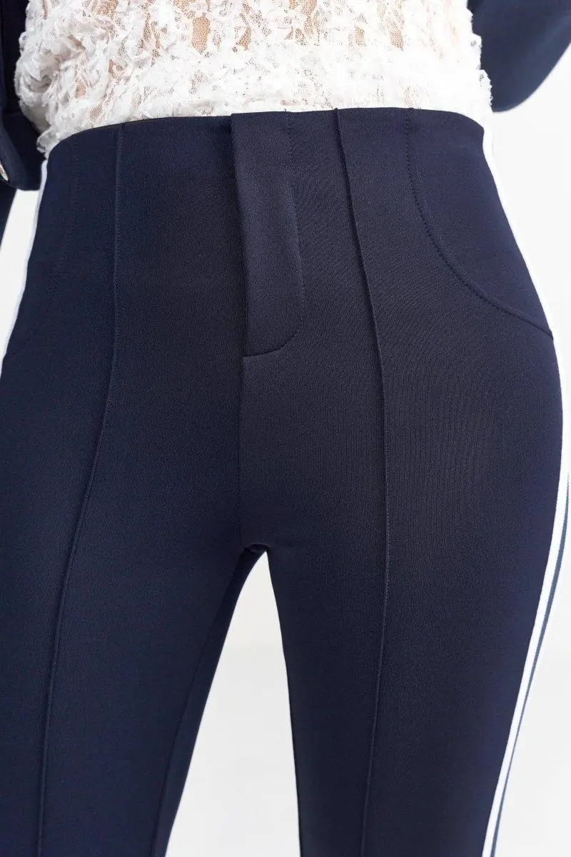 Темно-синие эластичные брюки добавят вашему образу нотку спортивного шика благодаря облегающему силуэту и элегантному переднему шву. Эластичный пояс делает их идеальными для стильных повседневных образов в стиле athleisure.