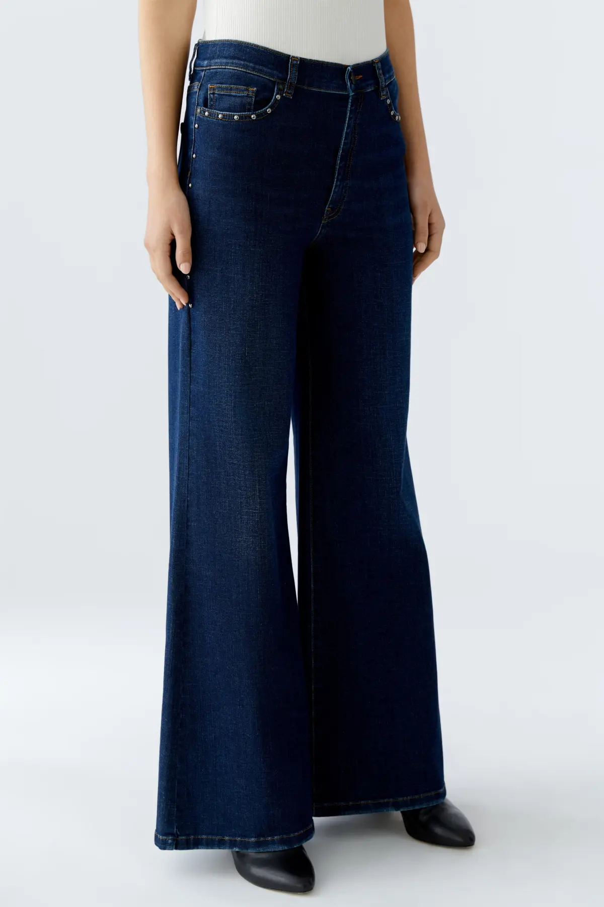 Джинсы палаццо с длинными, широкими штанинами и заклепками, которые подчеркивают характер, выполнены эластичной джинсовой смеси с эффектом аутентичного использования темно-синего цвета.