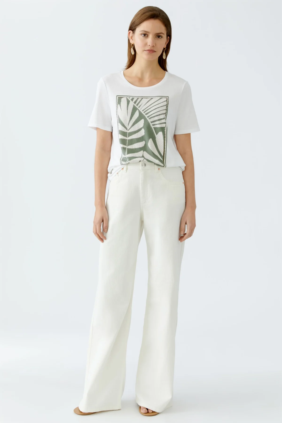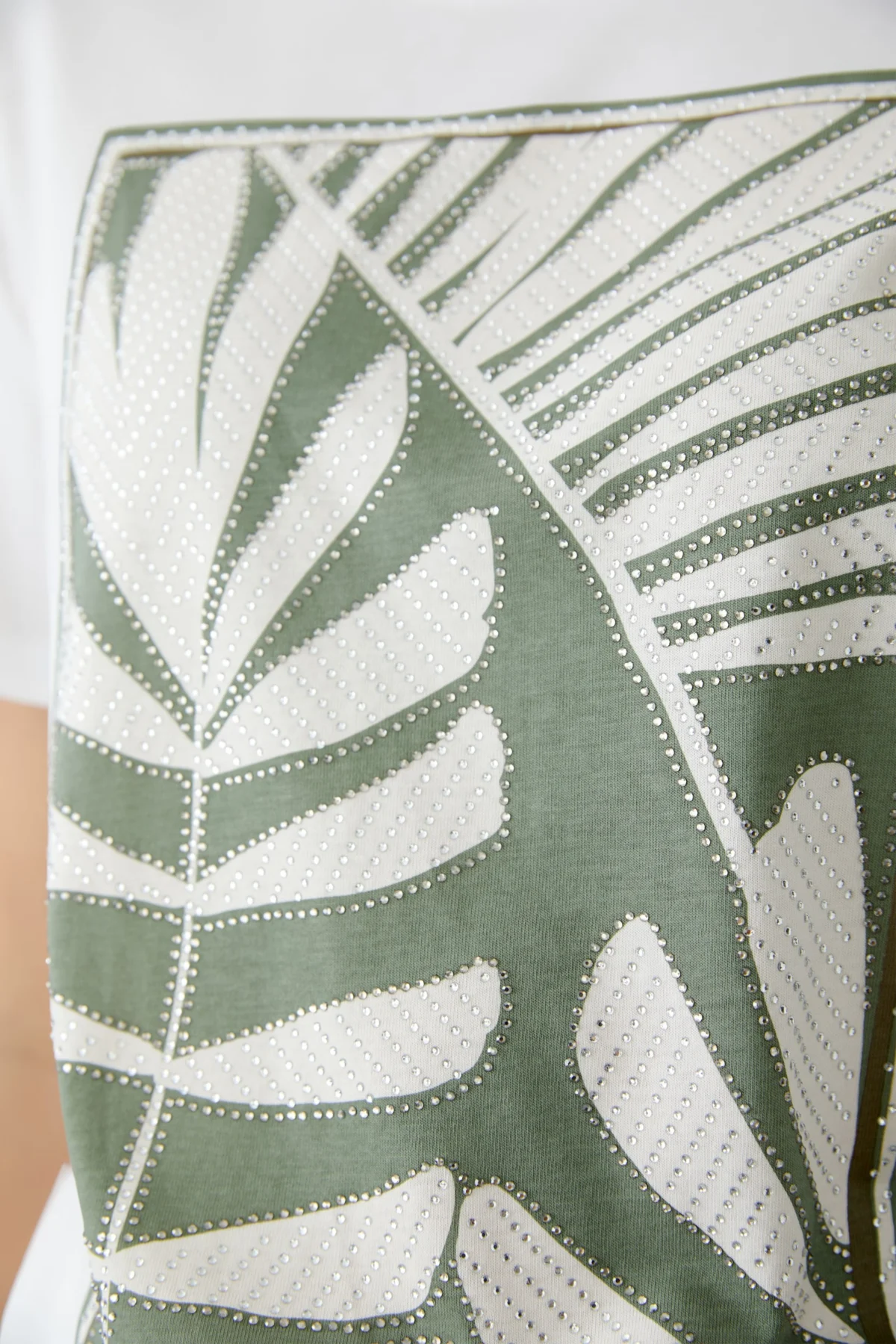 Футболка Oui с принтом в виде листьев, богато украшенная стразами, из органического хлопка с крупным рисунком на спине и мелким принтом на груди.