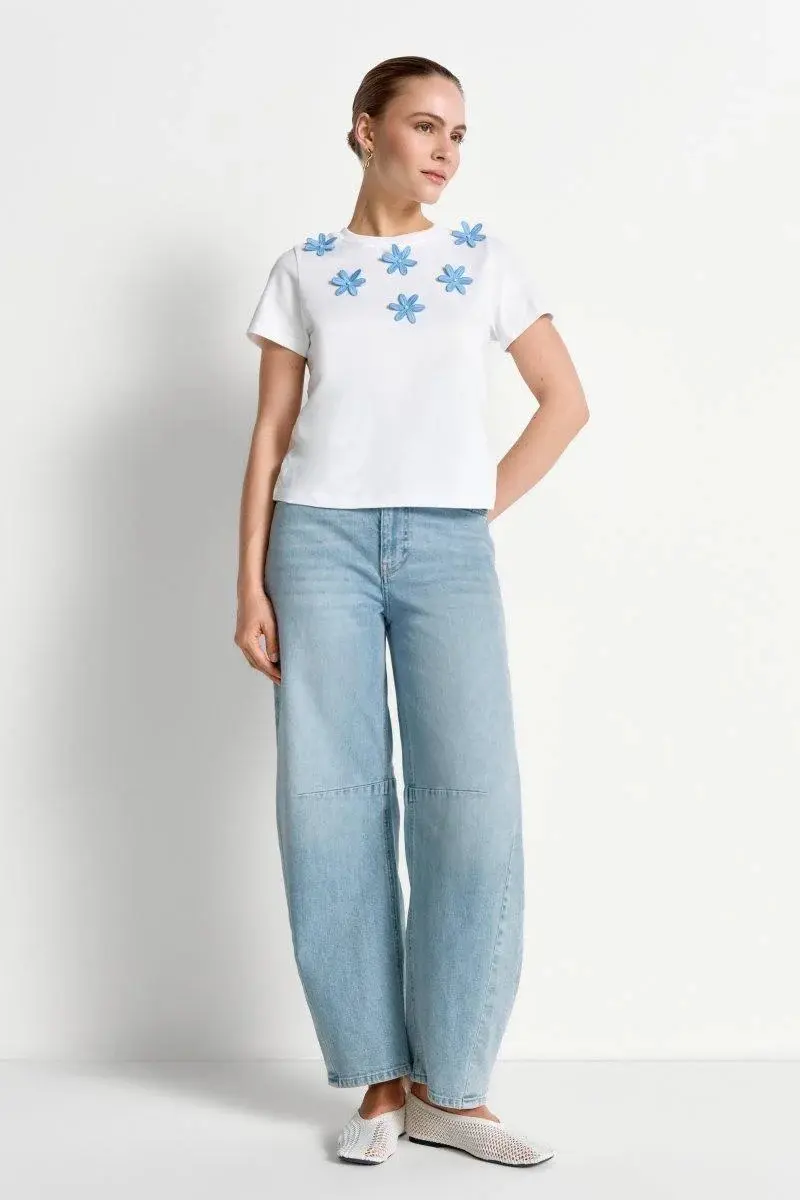 Эта белая футболка с небесно-голубыми объемными цветами — женственная, модная базовая вещь для современных повседневных образов. Широкий ребристый воротник и короткие рукава обеспечивают удобную посадку и делают эту футболку с принтом отличным дополнением к джинсам с высокой талией.