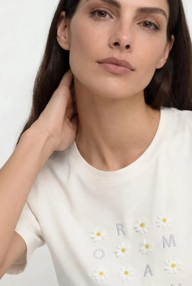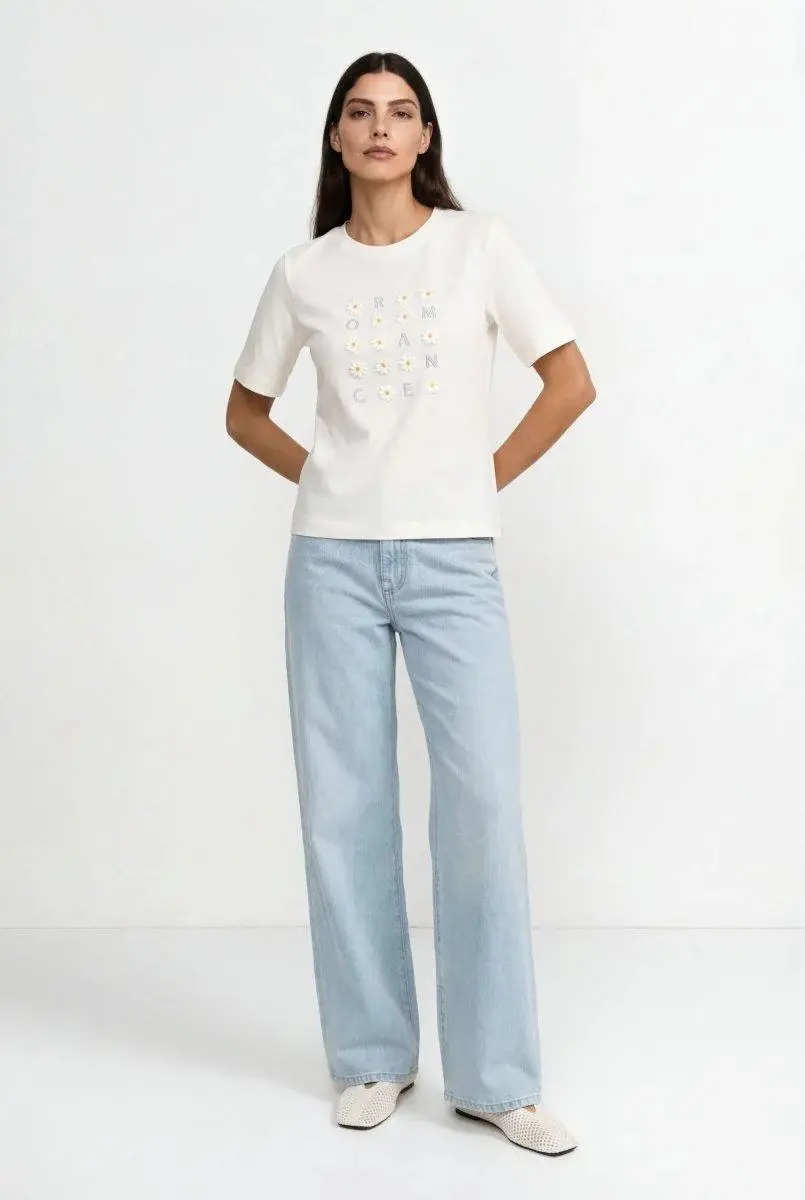 Эта кремовая футболка с вышитыми ромашками и словом «ROMANCE» — игривая и незаменимая вещь для повседневных образов. Цветочная вышивка добавляет женственности и придает лаконичному крою летний оттенок.