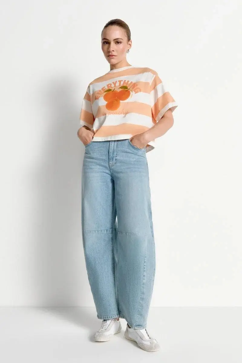 Укороченная футболка в бело-абрикосовую полоску, свободного кроя из мягкого хлопкового трикотажа станет ярким женственным акцентом. Персиковый принт с надписью добавляет урбанистический колорит.
