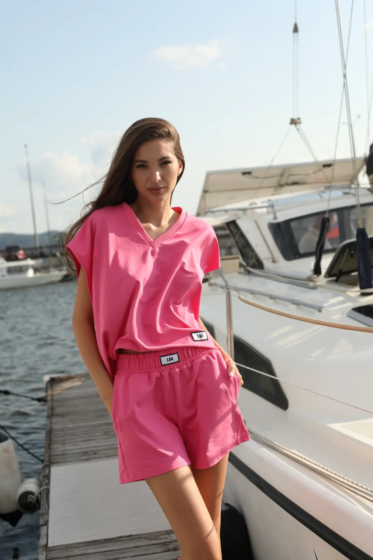 Мягкий и удобный костюм J.B4 в розовом цвете из футболки и шорт прекрасно подходит для дома и отдыха.