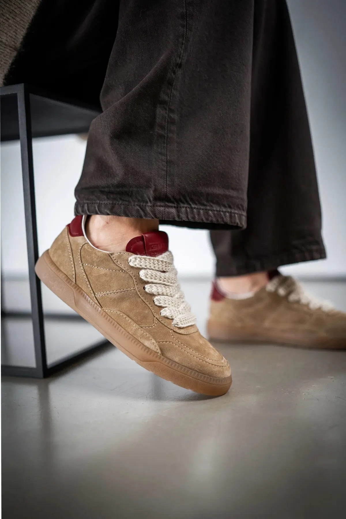 Это кроссовки с лаконичным спортивным дизайном и элегантными цветовыми акцентами. Высококачественный светло-коричневый замшевый верх дополняется подошвой в тон, создавая гармоничный минималистичный образ. Сдержанные детали из красной кожи наппа расставляют акценты и придают дизайну индивидуальность. Вязаные шнурки натурального цвета завершают образ, делая его современным и в то же время непринужденным. Кроссовки для стильных минималистов, ценящих экстравагантность.
