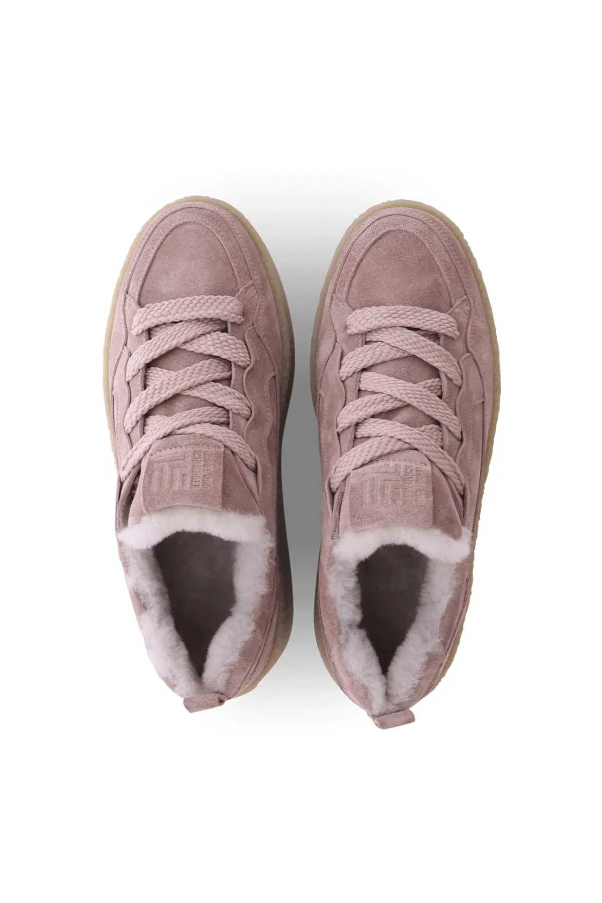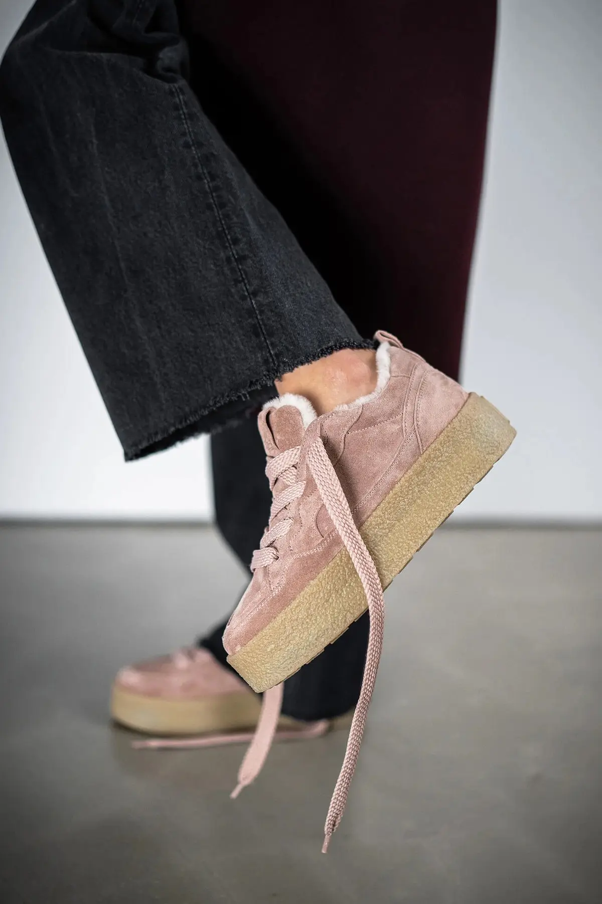 Нежный тон, строгий внешний вид: эти кроссовки из мягкой замши тёмно-розового цвета привносят женственную лёгкость в холодное время года. Многочисленные декоративные швы на кожаном верхе придают модели особую глубину и изысканность ручной работы, а подкладка из натуральной белой кожи ягнёнка обеспечивает уют и тепло. Эффектная приподнятая креповая подошва натурально-бежевого цвета стильно контрастирует с верхом и обеспечивает оптимальную амортизацию для особенно комфортного ощущения. Кроссовки сочетают в себе практичность, тепло и городской шик — идеально для стильных повседневных образов с изюминкой.