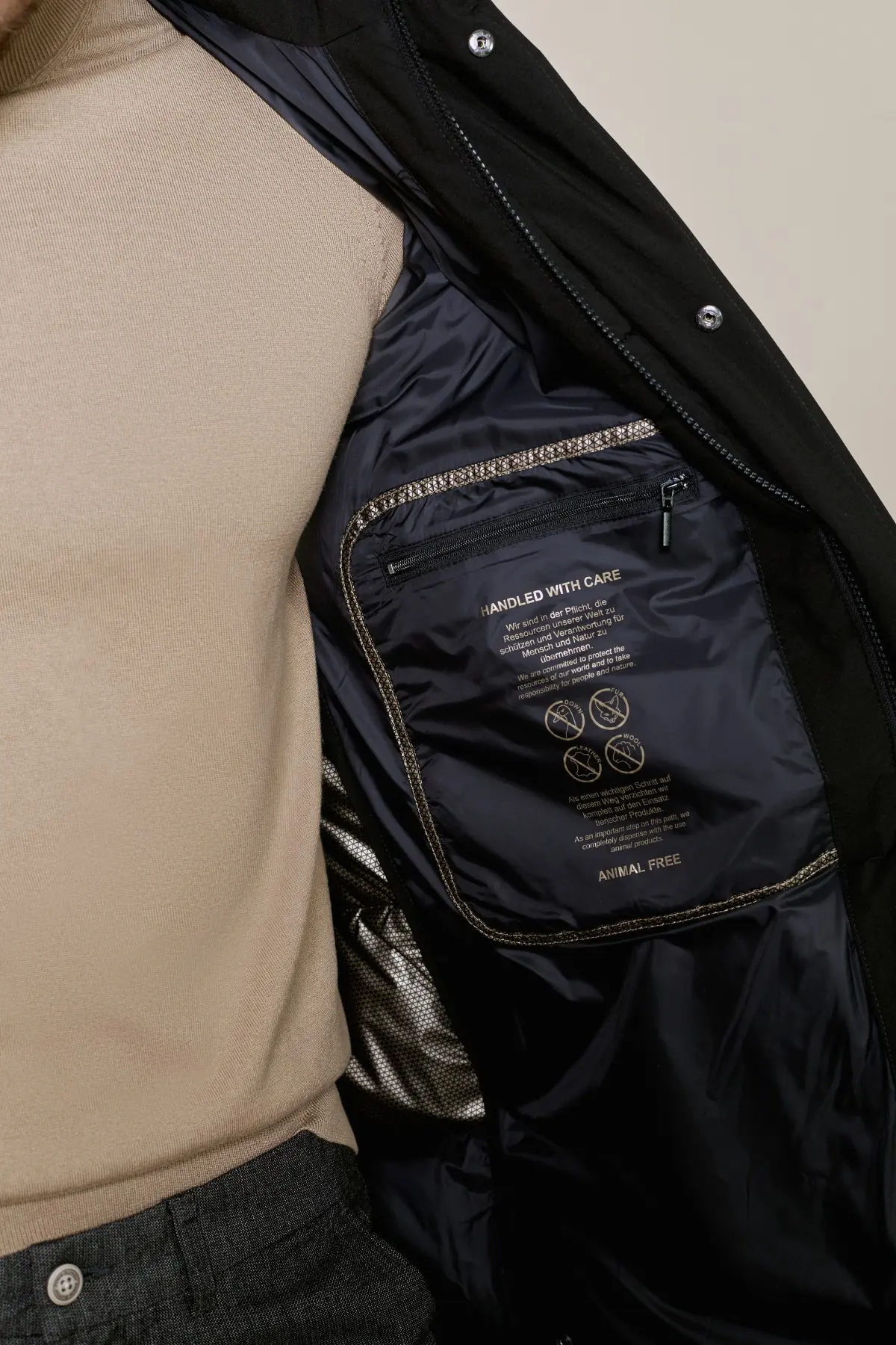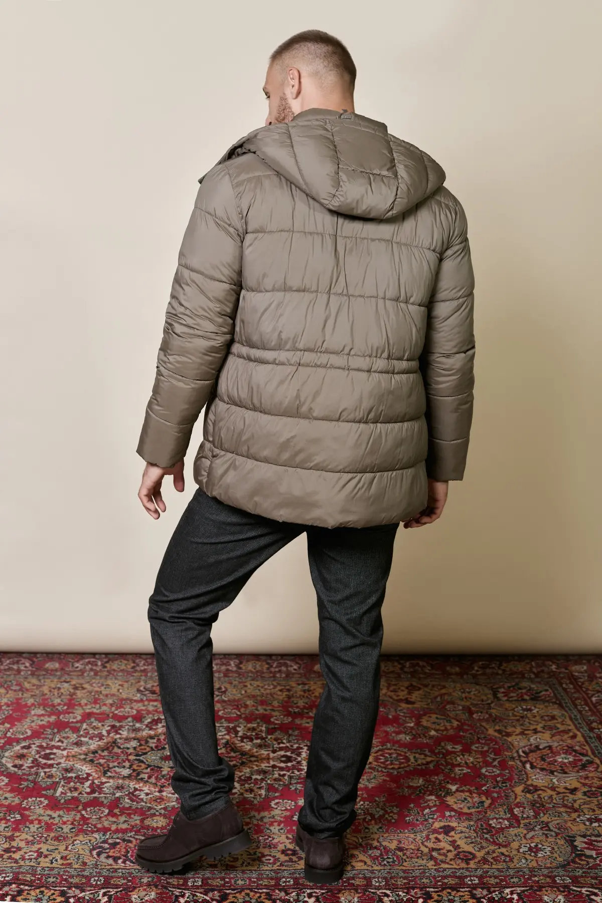 Теплая стеганая куртка Bugatti имеет отстегивающийся капюшон, боковые карманы, застежку на молнию и кнопки.