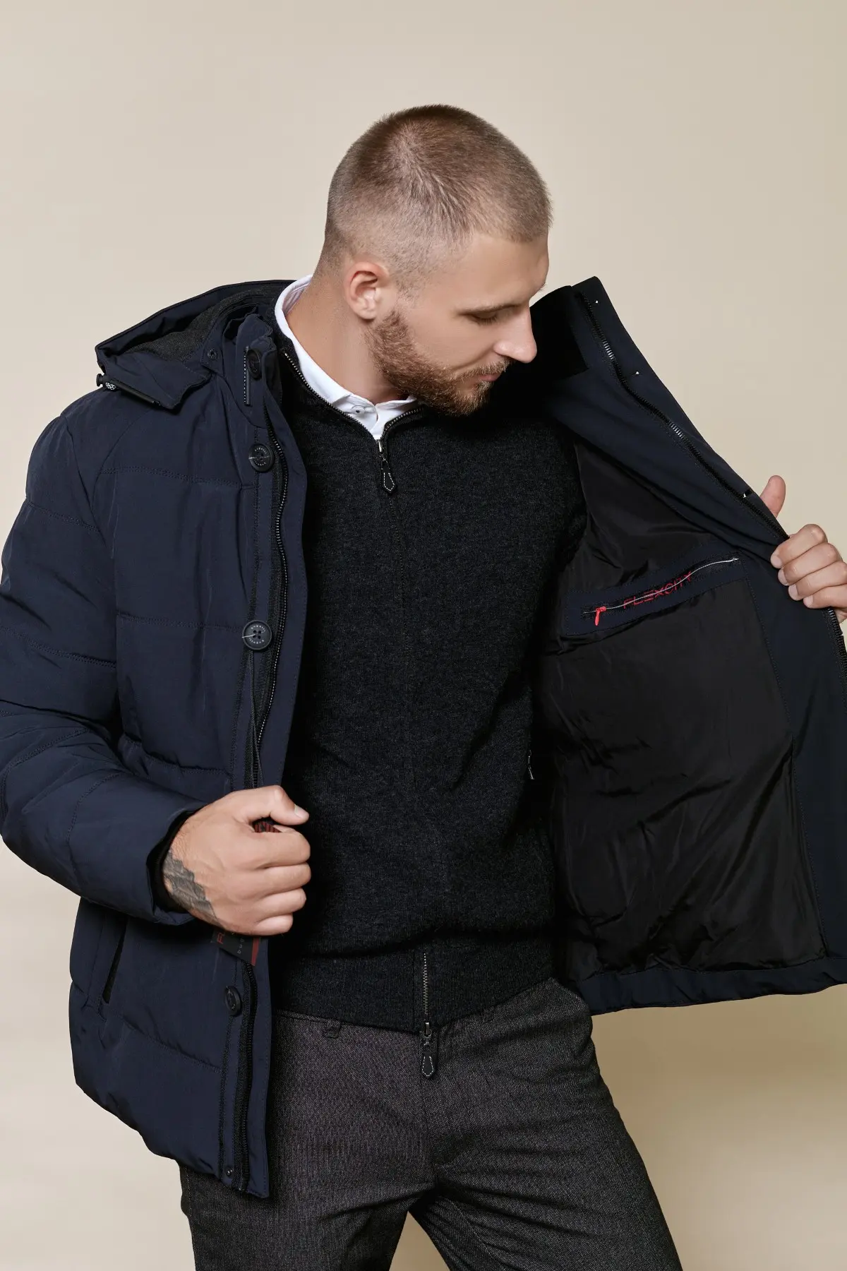 Теплая куртка Bugatti имеет капюшон с регулировкой, боковые карманы, внутренний карман, застежку на молнию и пуговицы.
