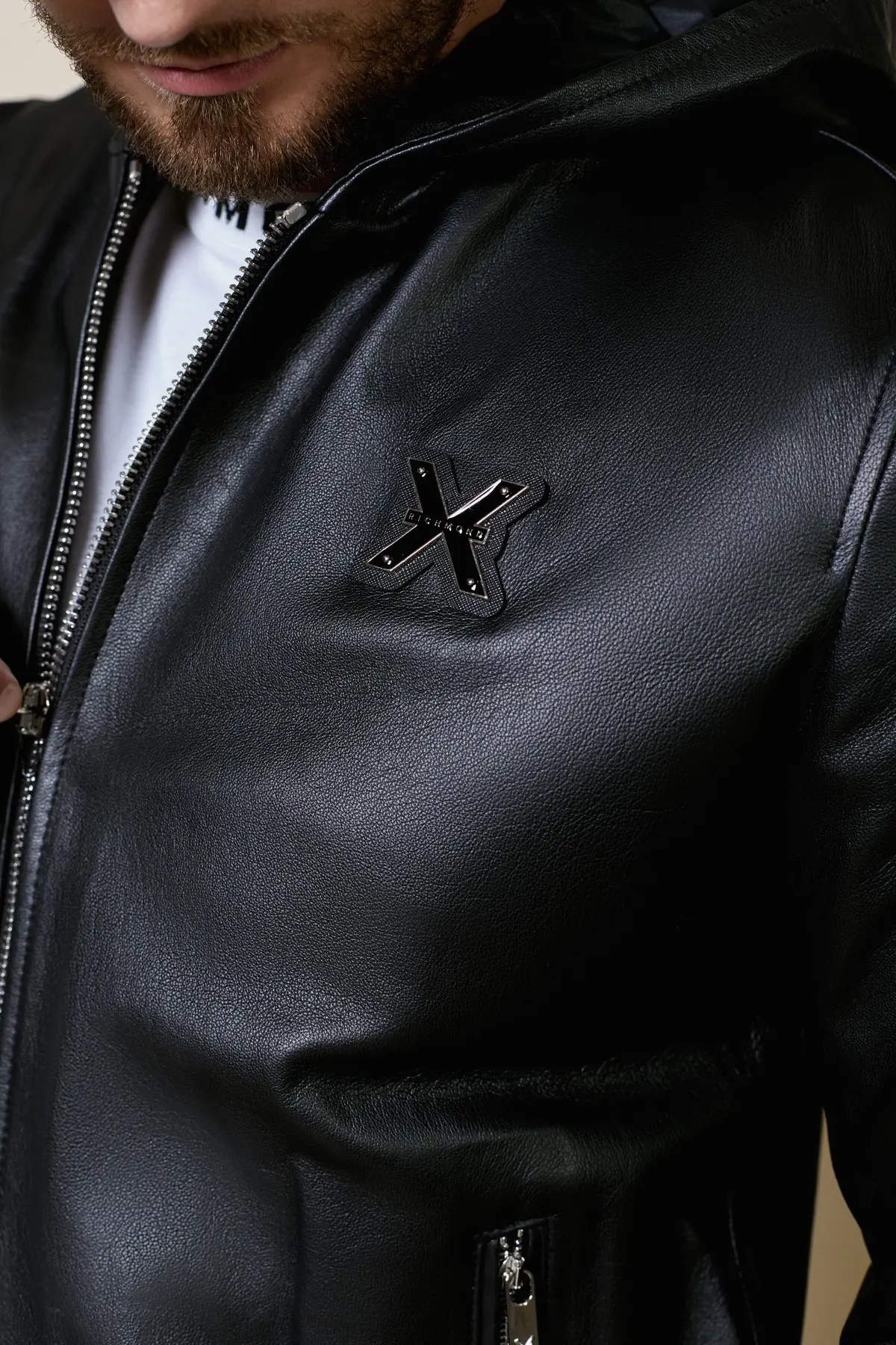 Кожаная куртка с логотипом на груди, круглым вырезом горловины, несъемным капюшоном, с рукавами с эластичными манжетами.