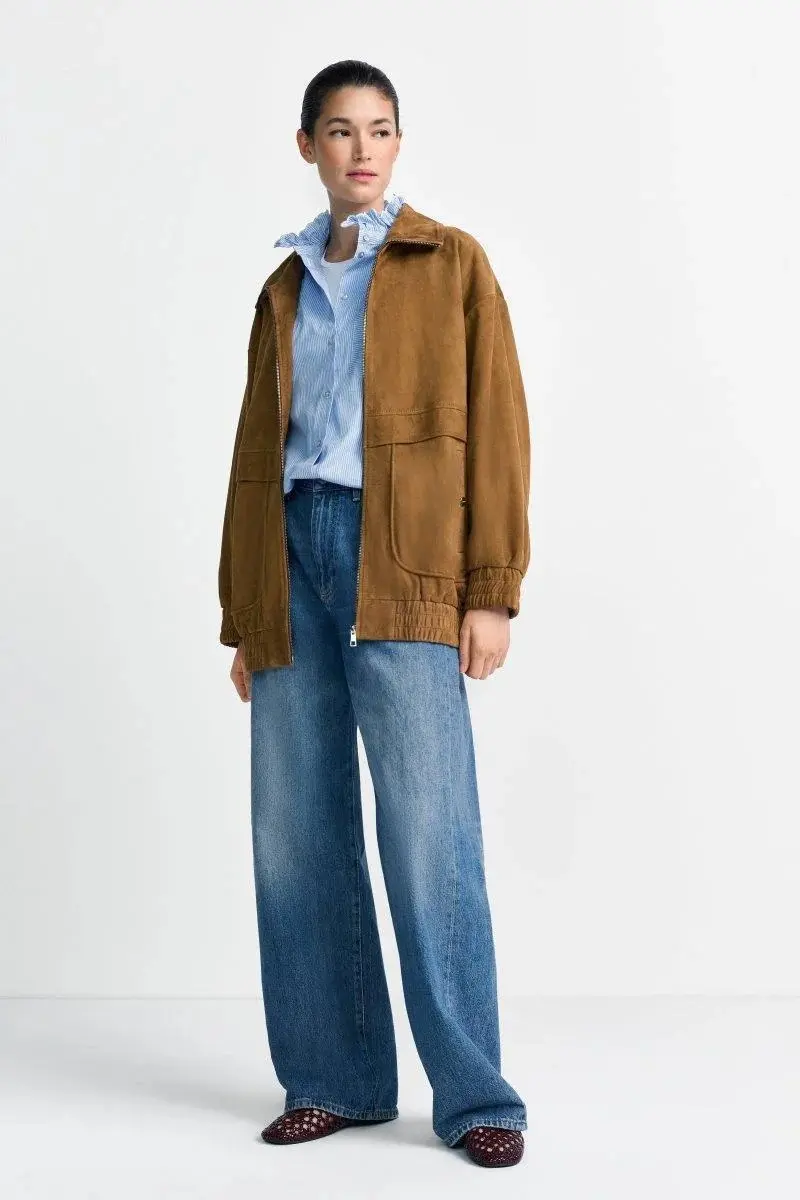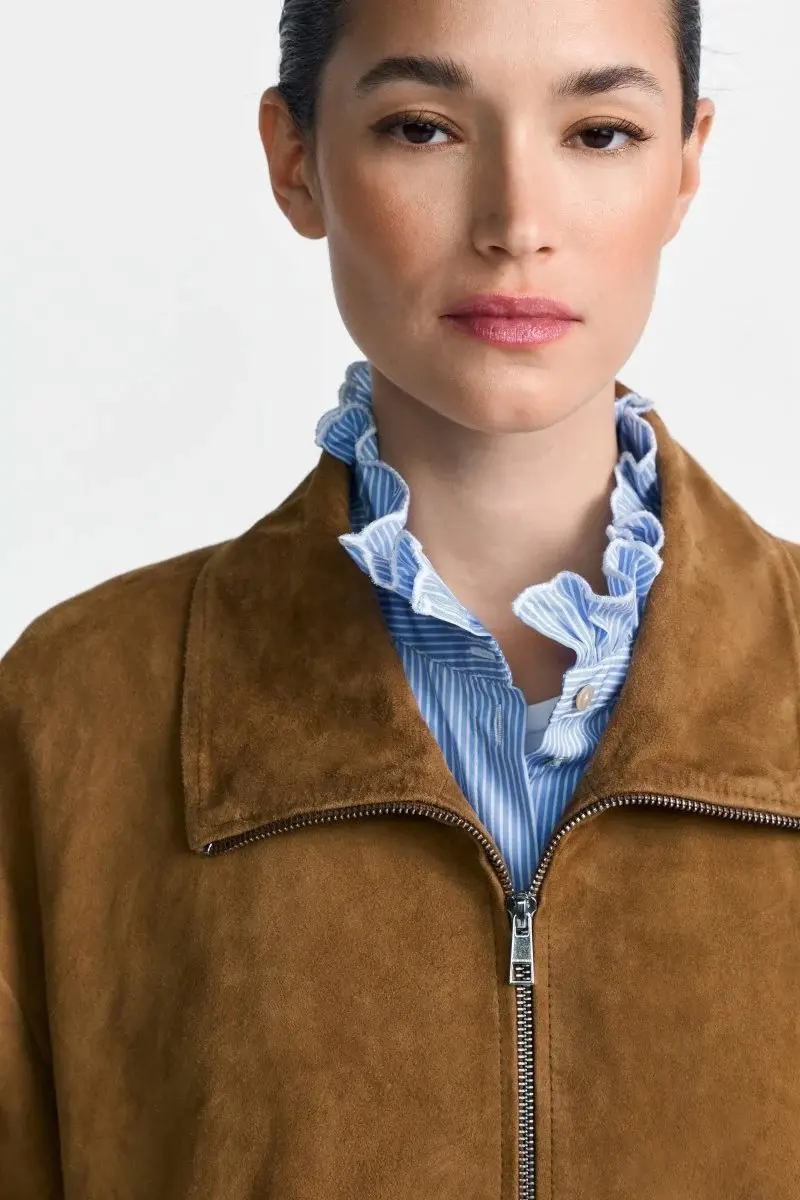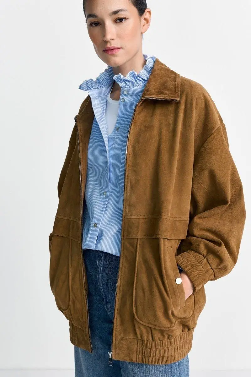 Эта объемная куртка-бомбер из искусственной замши добавит вашим образам нотку роскошного повседневного стиля. Сборки на манжетах, серебристая молния и накладные карманы придают ей спортивно-элегантный ретро-вид – это вневременная вещь, обладающая городским шармом.