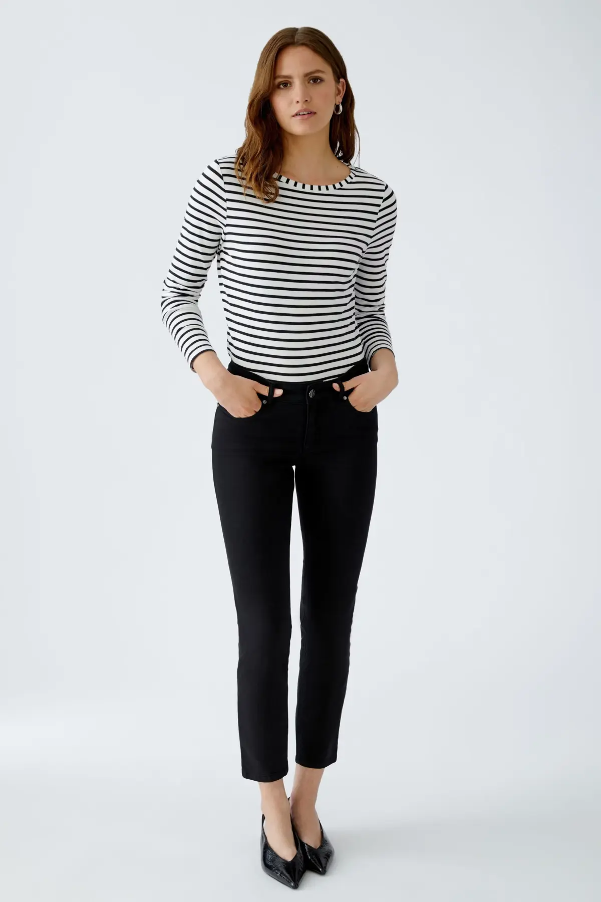 Легкий полосатый лонгслив Oui из приятного хлопково-модального материала с трикотажными полосками. Полосы не напечатаны, а связаны, что делает лонгслив особенно мягким. У лонгслива приталенный силуэт, поэтому он идеально подходит для многослойных образов.