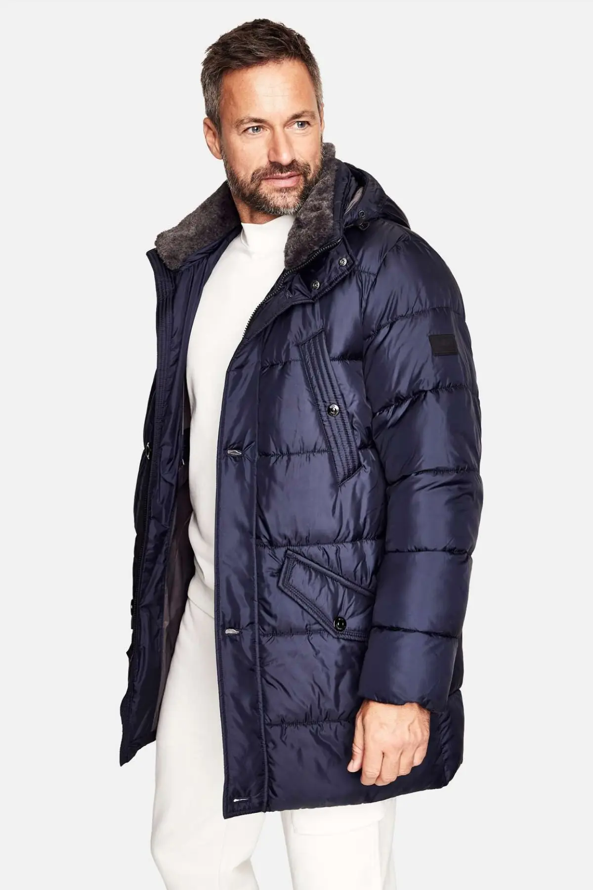 Практичная темно-синяя стеганая парка New Canadian со множеством деталей и карманов. Парка изготовлена из ветро- и водоотталкивающей ткани, которая защищает от дождя и мокрого снега. Капюшон очень хорошо прилегает и при необходимости отстегивается. Благодаря удобной длине, закрывающей бедра, куртку можно хорошо сочетать с одеждой в деловом стиле, также парка прекрасно впишется и в гардероб в стиле кэжуал.