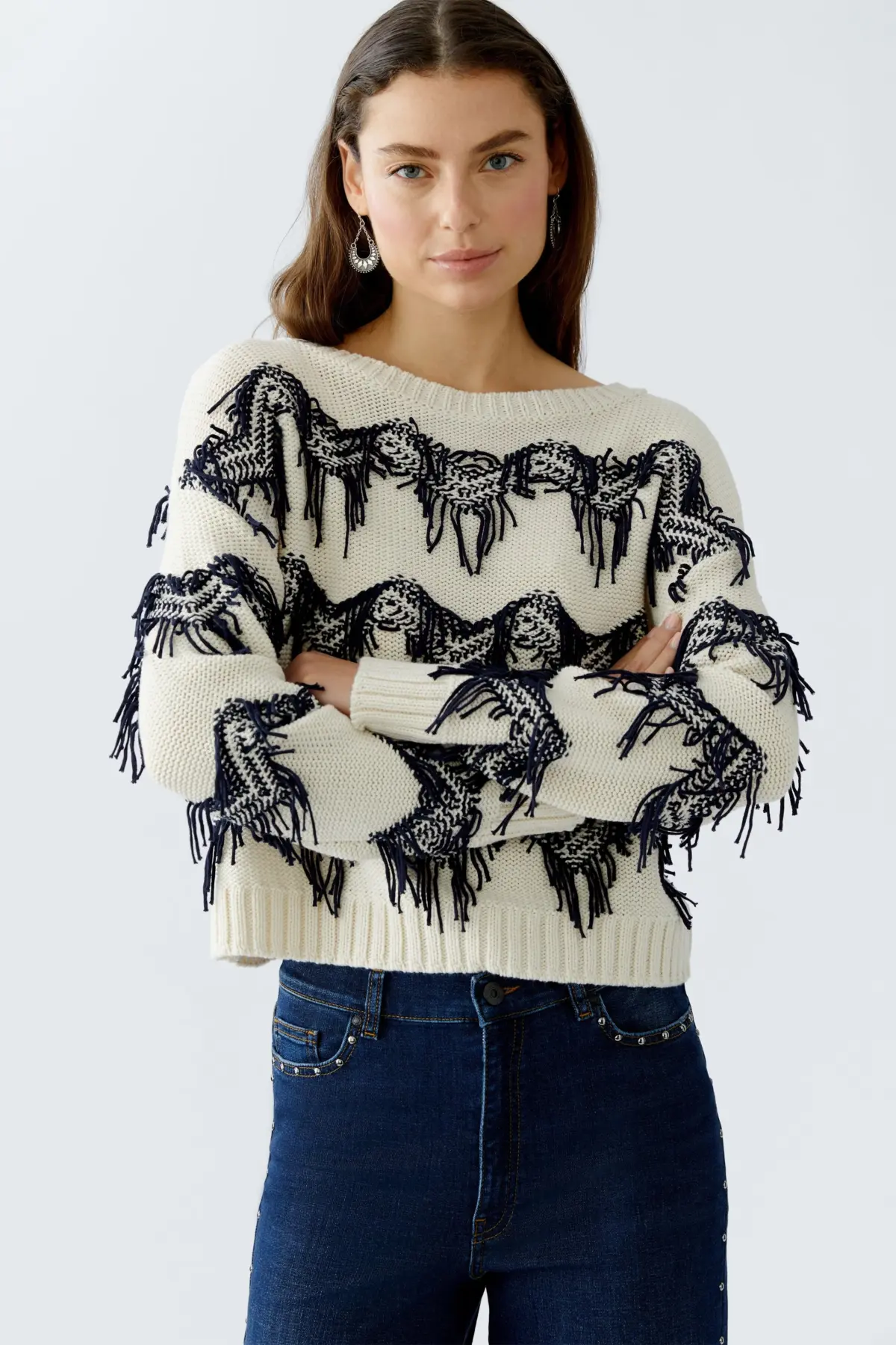 Яркий пуловер с зигзагообразным узором, подчеркнутый вязаной и нарезанной вручную бахромой. Пуловер из хлопка с бахромой из мягкой смесовой пряжи свободного кроя с ребристыми манжетами и укороченной длиной – идеальный спутник для прохладной погоды.