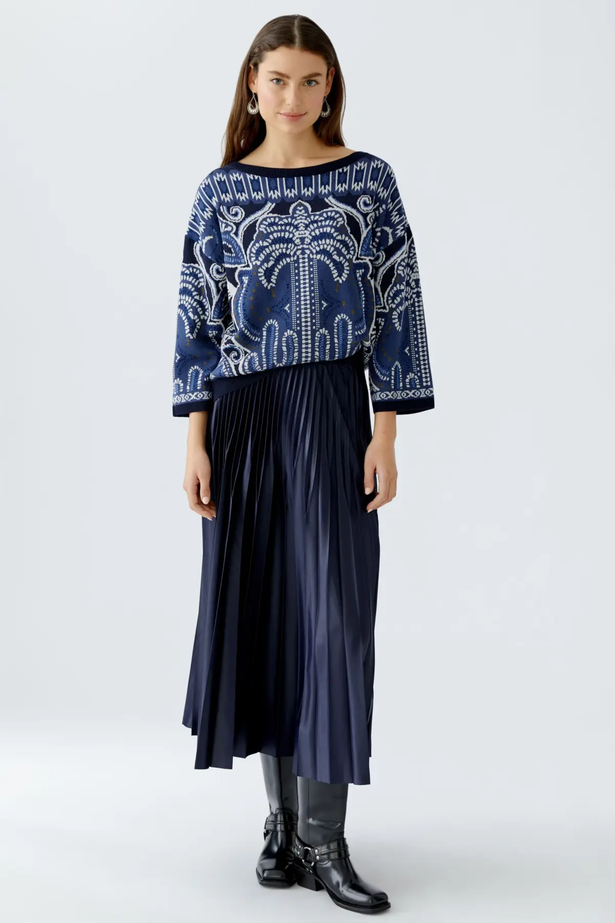 Изысканный жаккардовый пуловер Oui из смеси хлопка и вискозы с металлизированной нитью и с вырезом лодочкой.