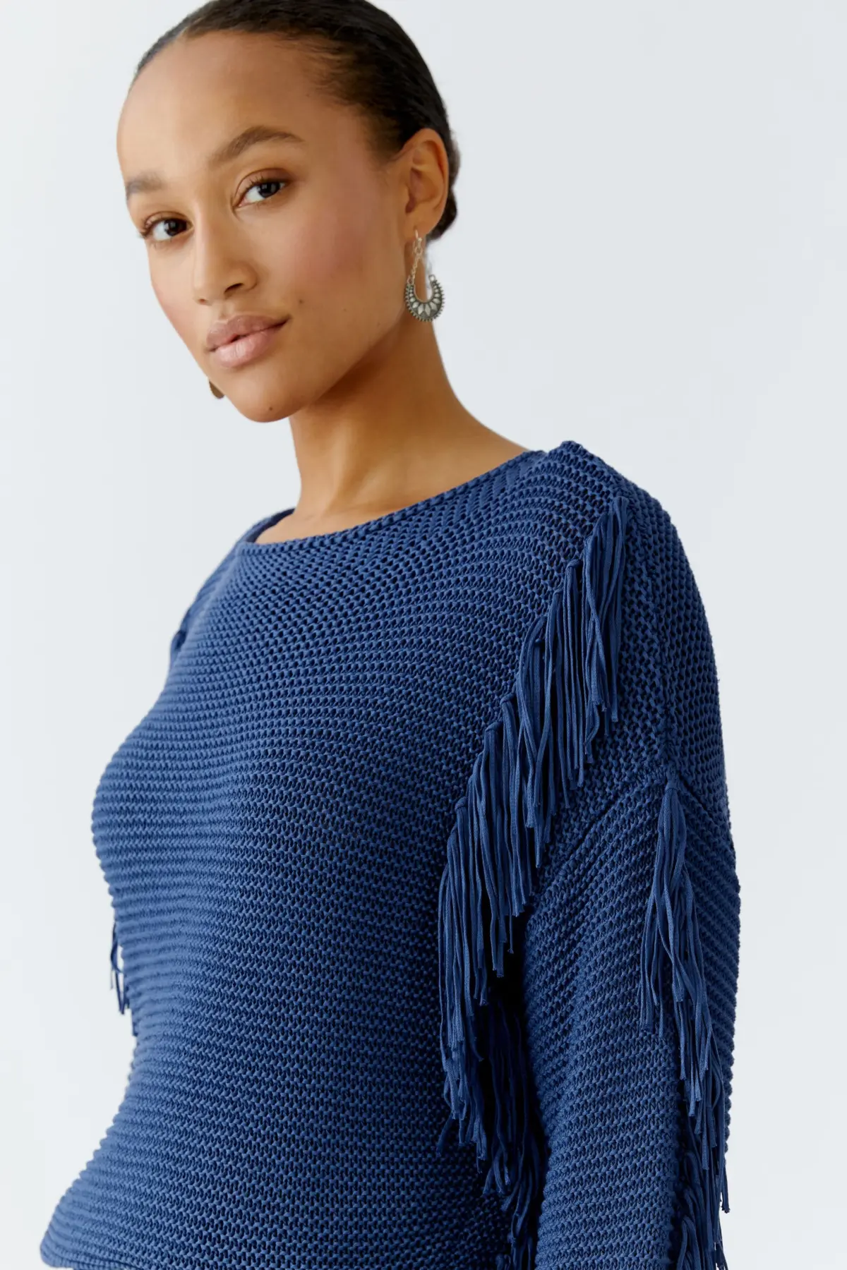 Пуловер из ленточной пряжи с бахромой, связанной вручную свободного кроя, слегка укороченной длины, умеренным вырезом лодочкой с небольшим подвернутым краем. Стилизуйте с вещами в стиле кэжуал.