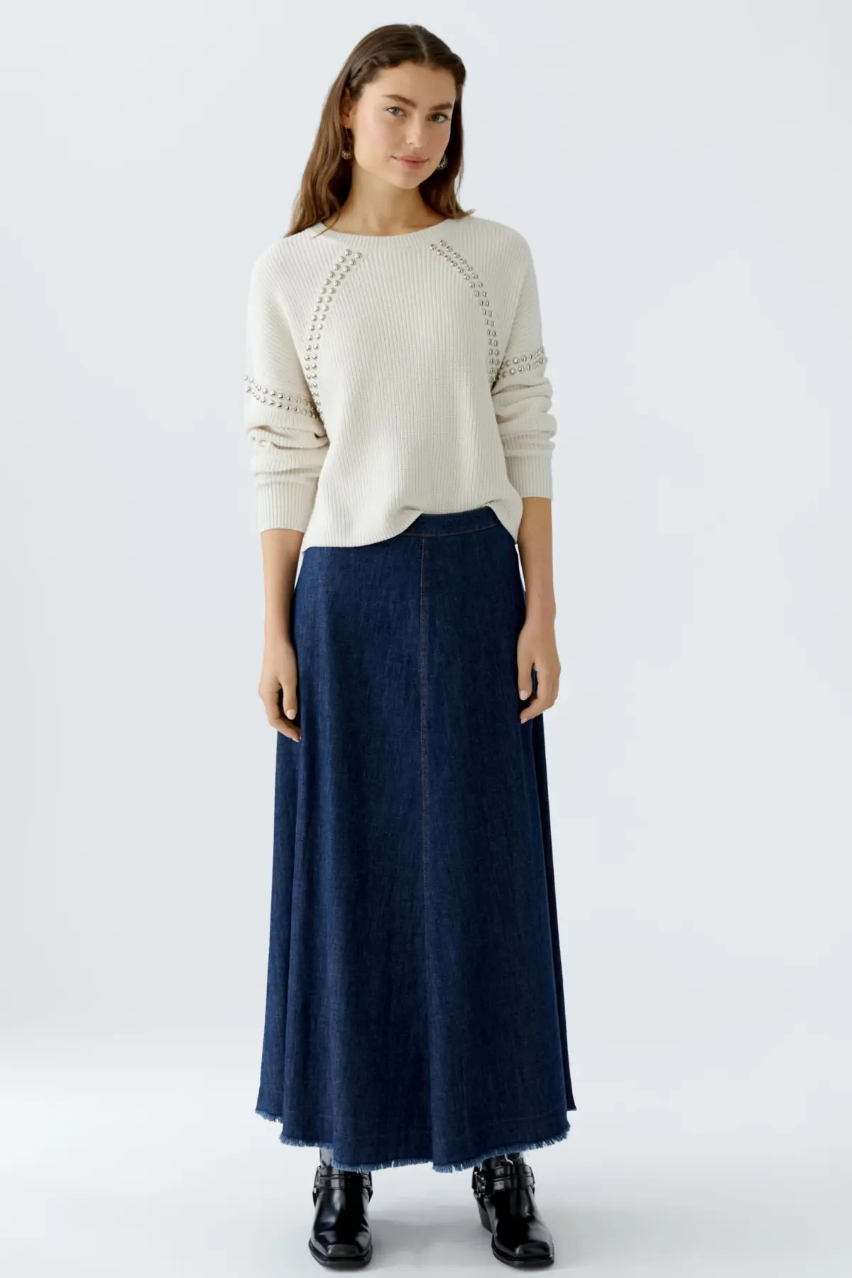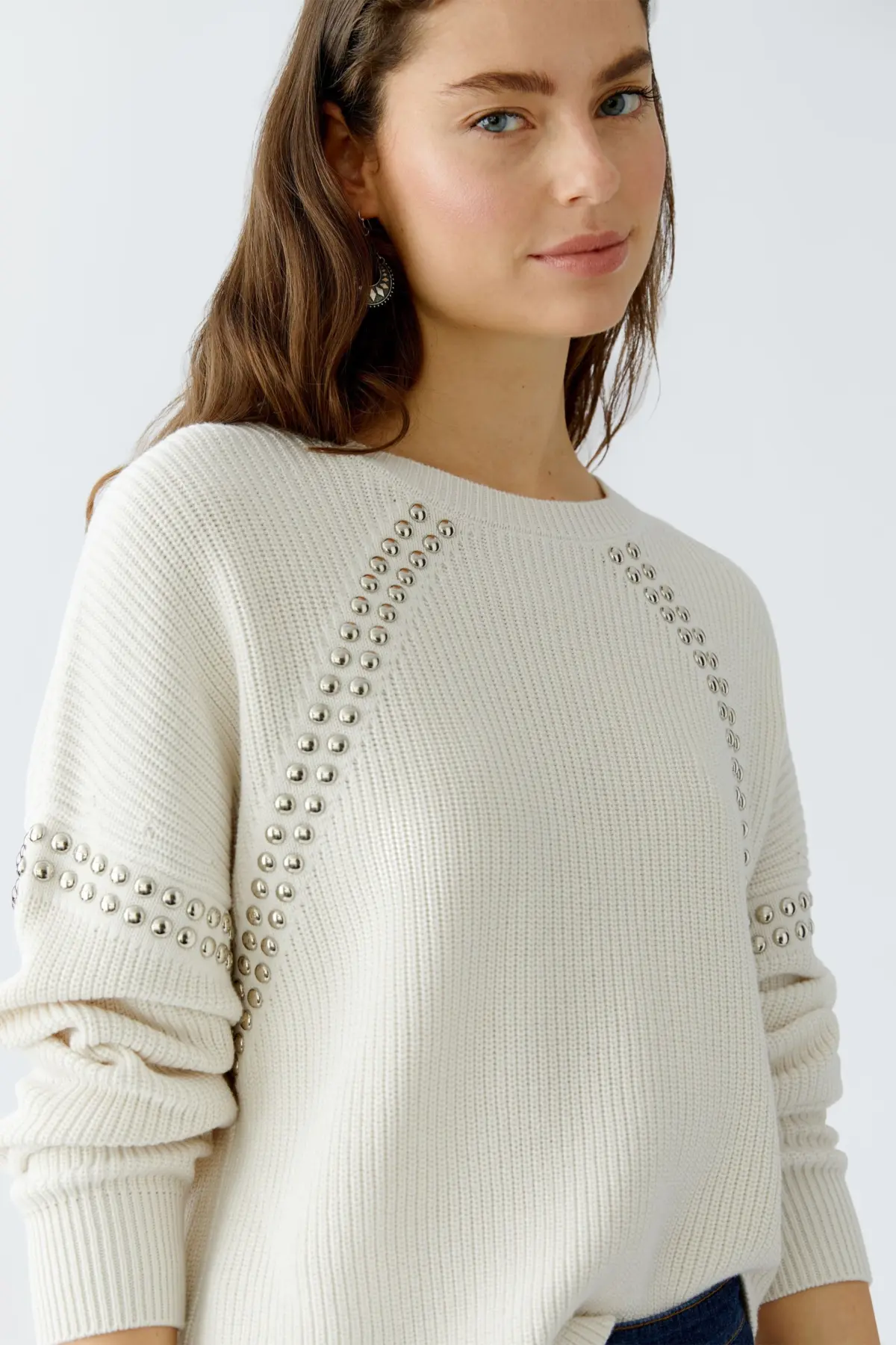Пуловер с металлическими заклепками на рукаве и на линии реглана из смеси хлопка, простой вязки резинкой. У пуловера свободный крой, укороченная длина, круглый вырез горловины с ребристыми манжетами, спущенное плечо.