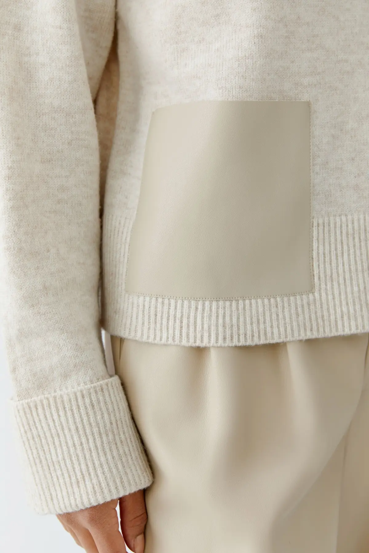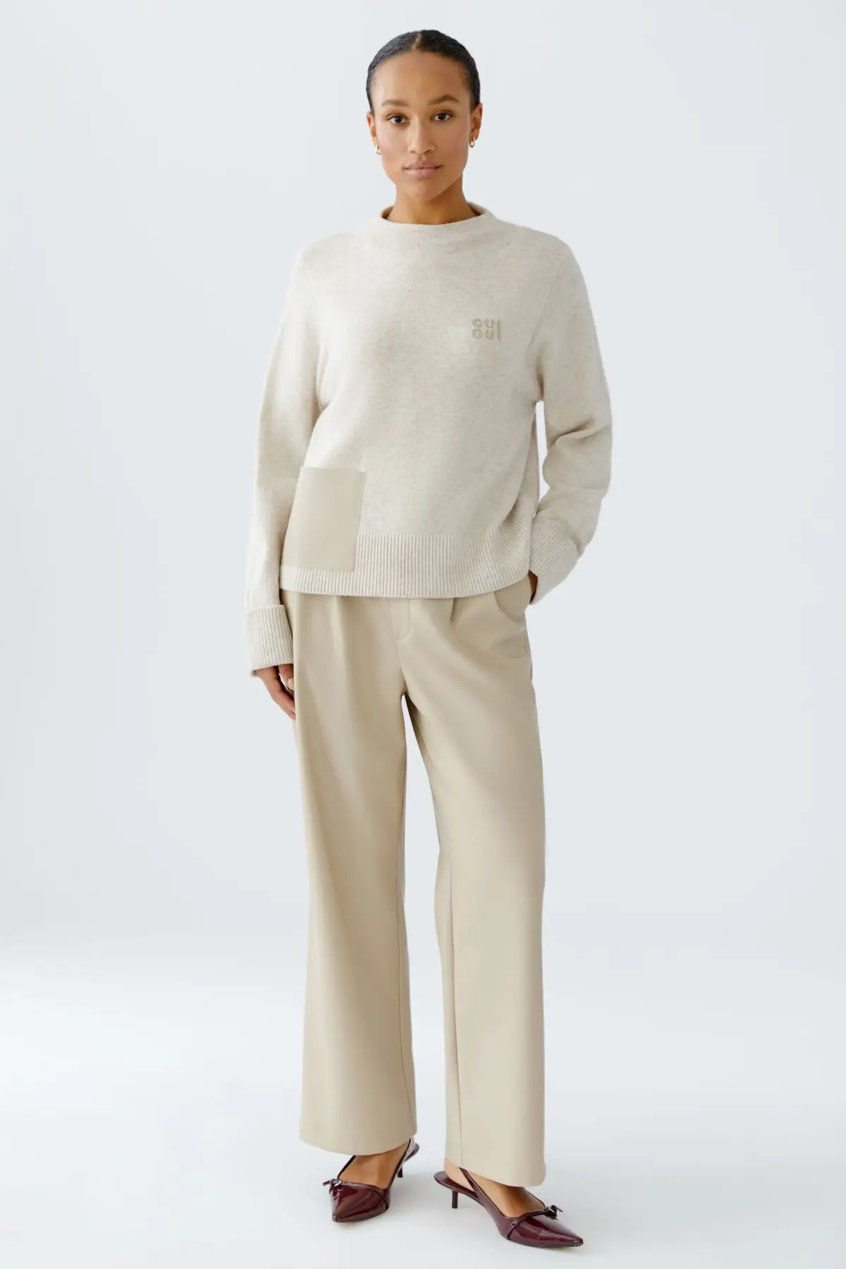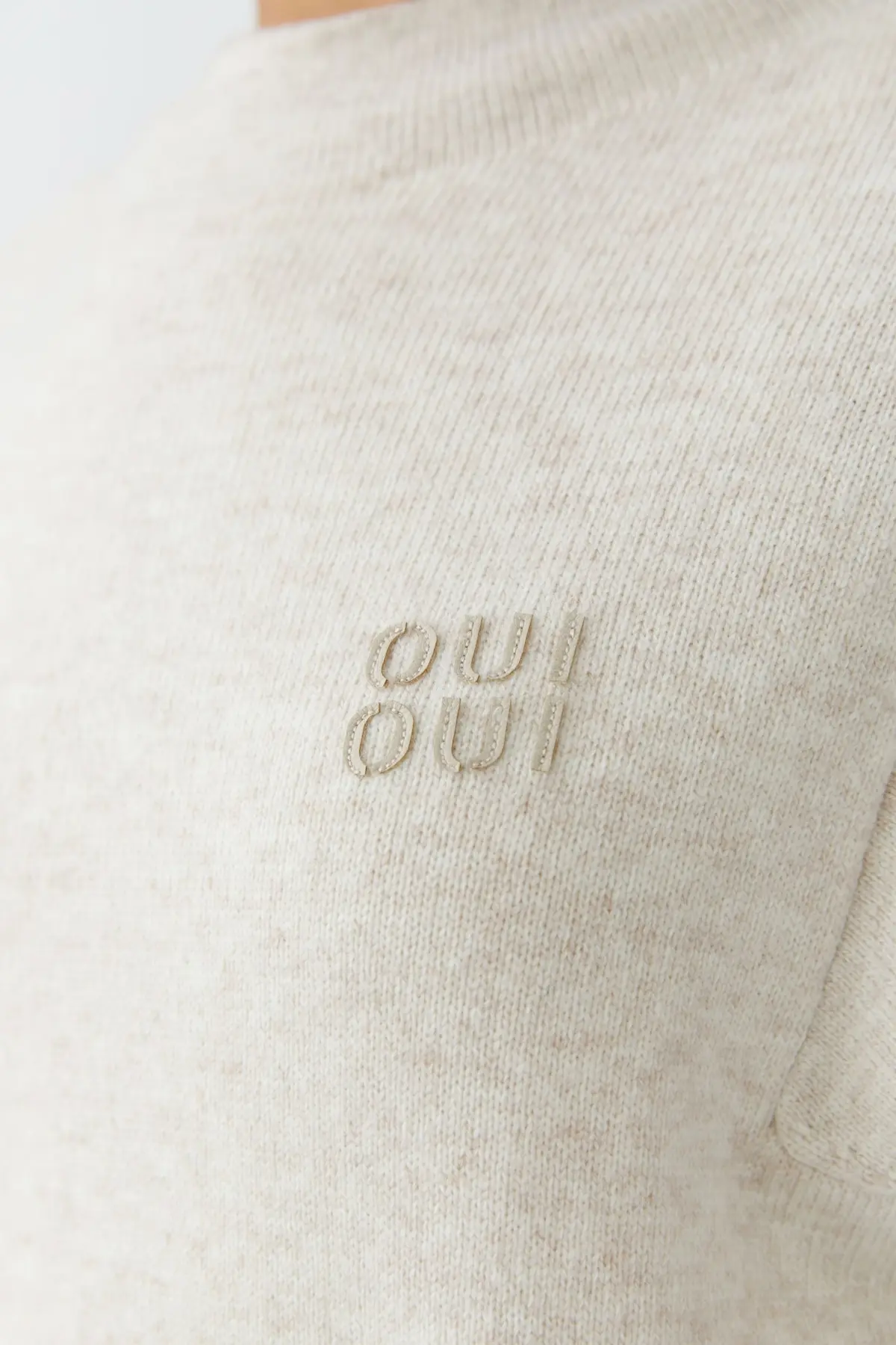 Уютный пуловер Oui с высококачественными деталями из кожи, у пуловера свободный крой, стандартная длина, короткий воротник-стойка с двойной резинкой, длинные квадратные втачные рукава с высокими манжетами из рубчатой ткани, большой карман и логотип OUI, вышитый из искусственной кожи.