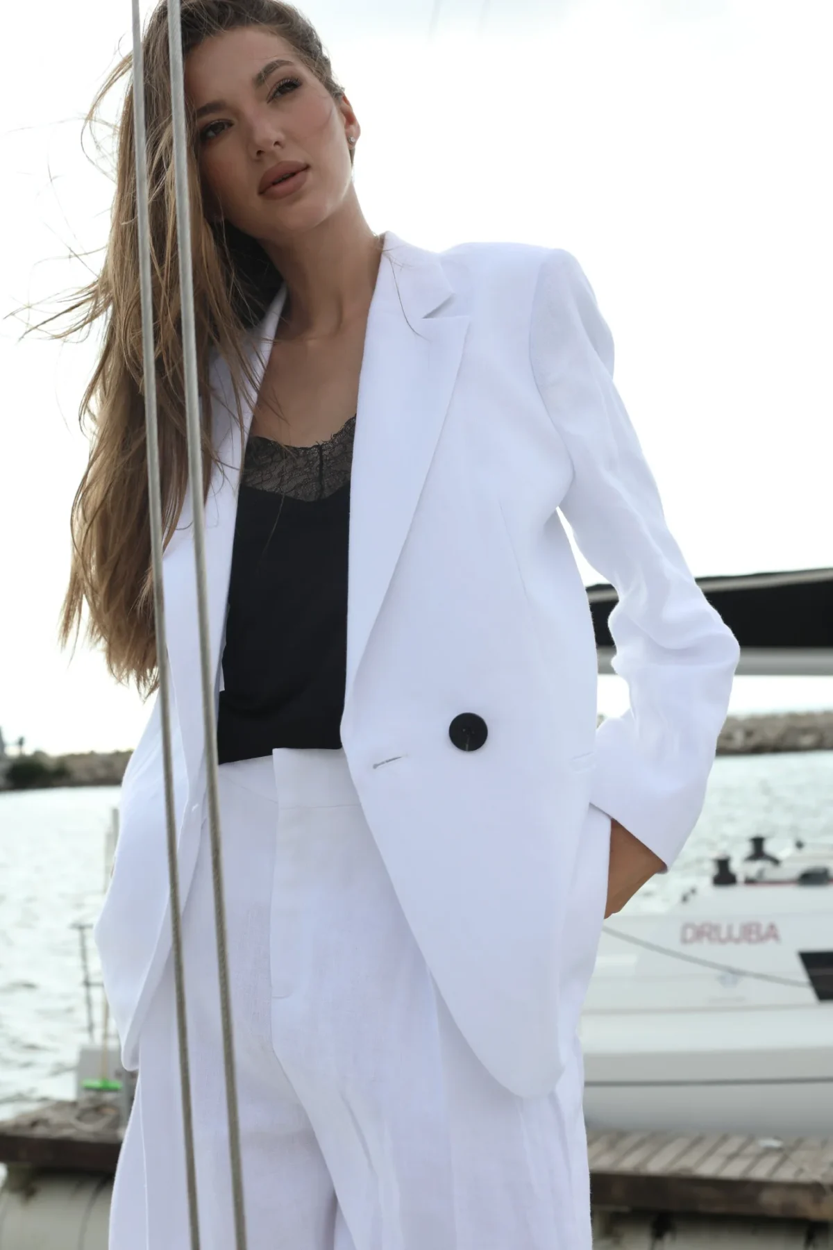 Белый жакет InWear из текстурированной льняной ткани с классическими лацканами и слегка свободным кроем. Застёгивается на одну чёрную пуговицу, имеет прорезные карманы и мягкую подкладку. Изысканный силуэт с современным акцентом.