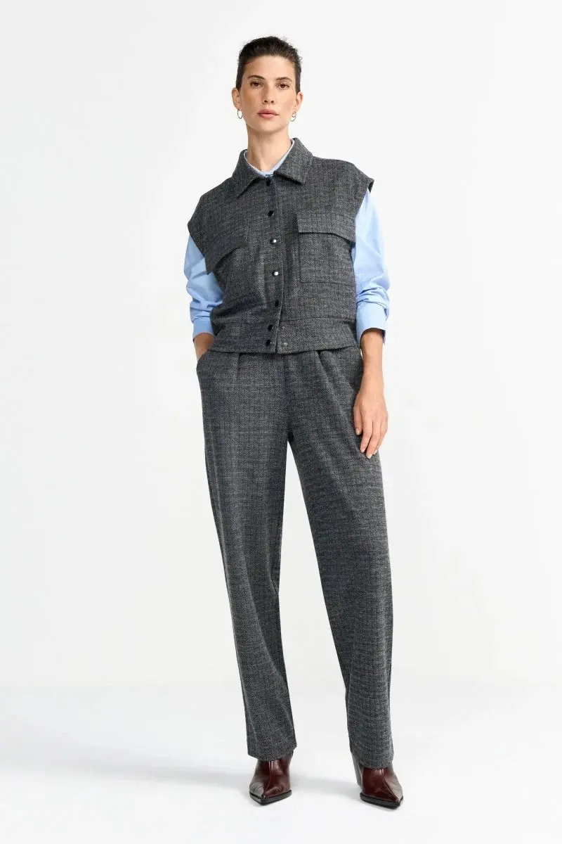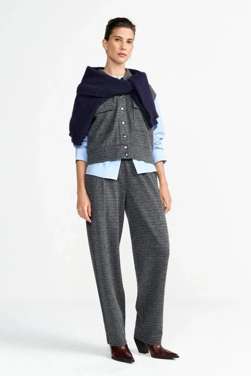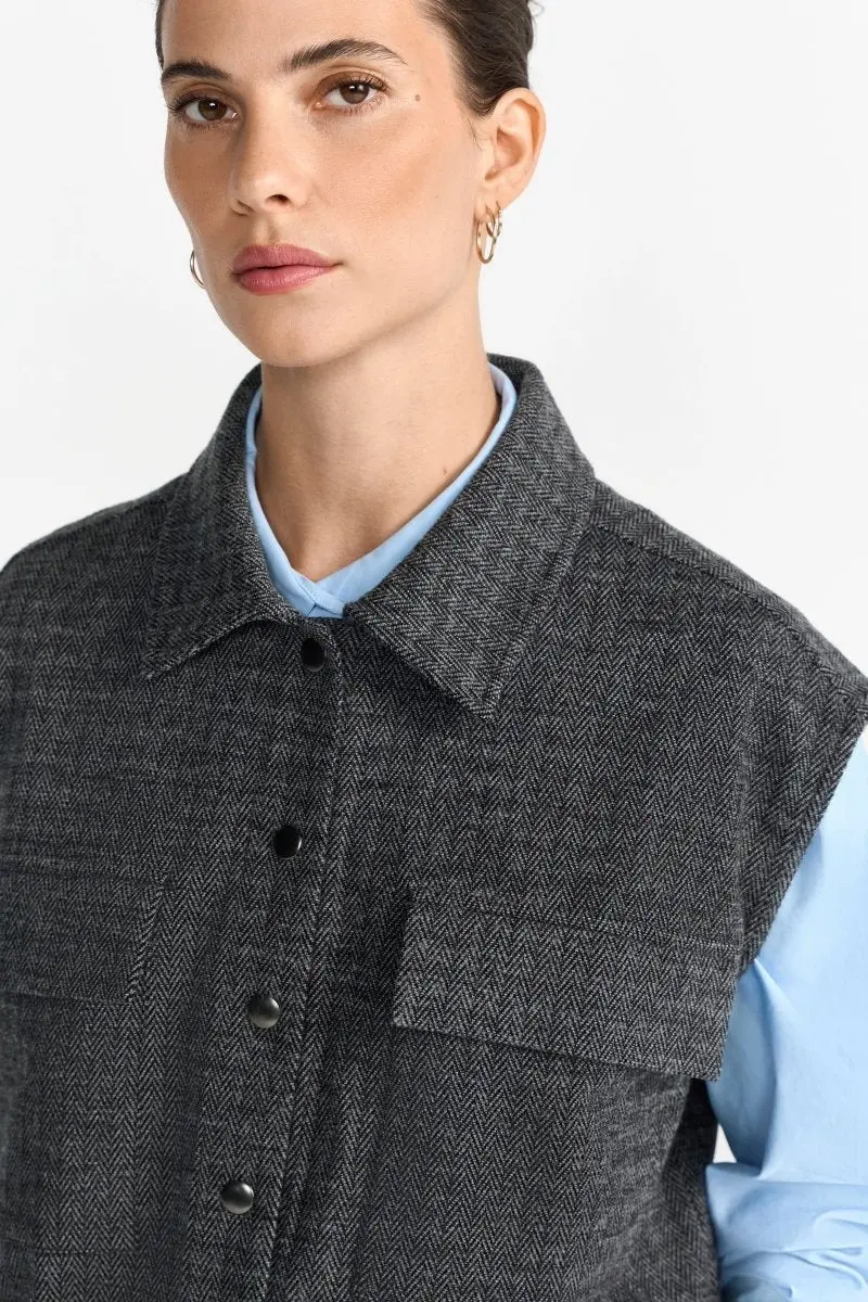 Серый жилет из мягкого твила с узором «в елочку» сочетает в себе практичные детали и современную эстетику кроя: силуэт с акцентом на плечах, планка с кнопками и карманы с клапанами делают его элегантным предметом гардероба для создания многослойных образов.